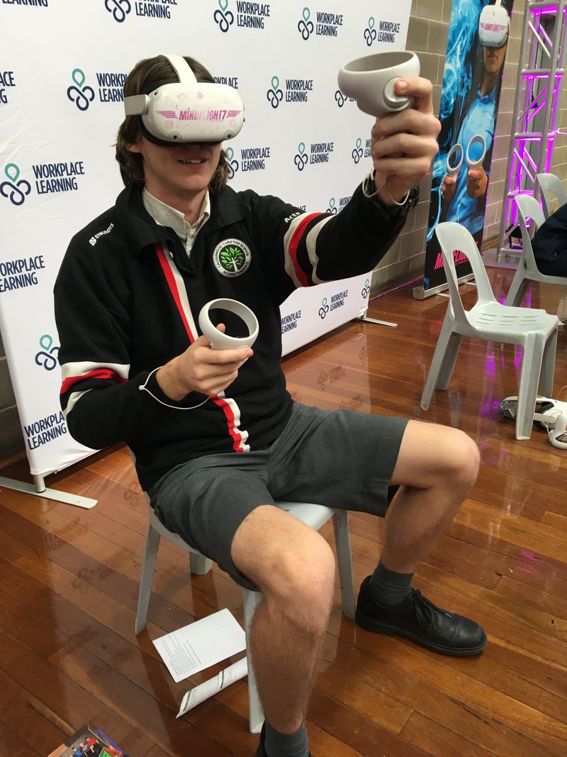 Some students were able to put on VR Headsets and participate in a variety of work situations, like flying a plane.